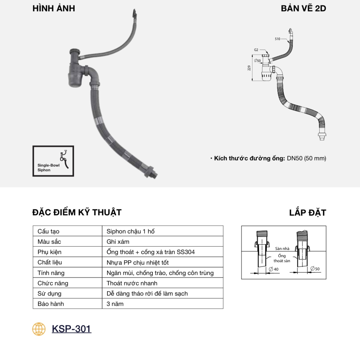 Siphon: Được sản xuất độc quyền sử dụng chất liệu PVC chịu nhiệt tốt, có lưu lượng thoát nước lớn. Đồng thời, với cấu tạo ngăn mùi, ngăn nước trào ngược, chống côn trùng, siphon Kluger giữ cho không gian bếp luôn thông thoáng và sạch sẽ.